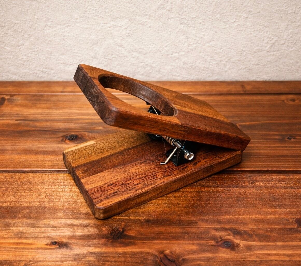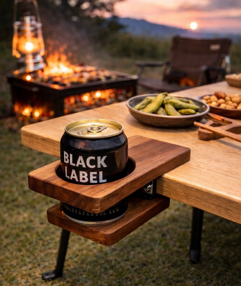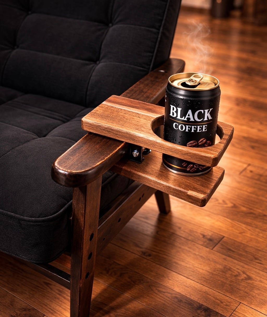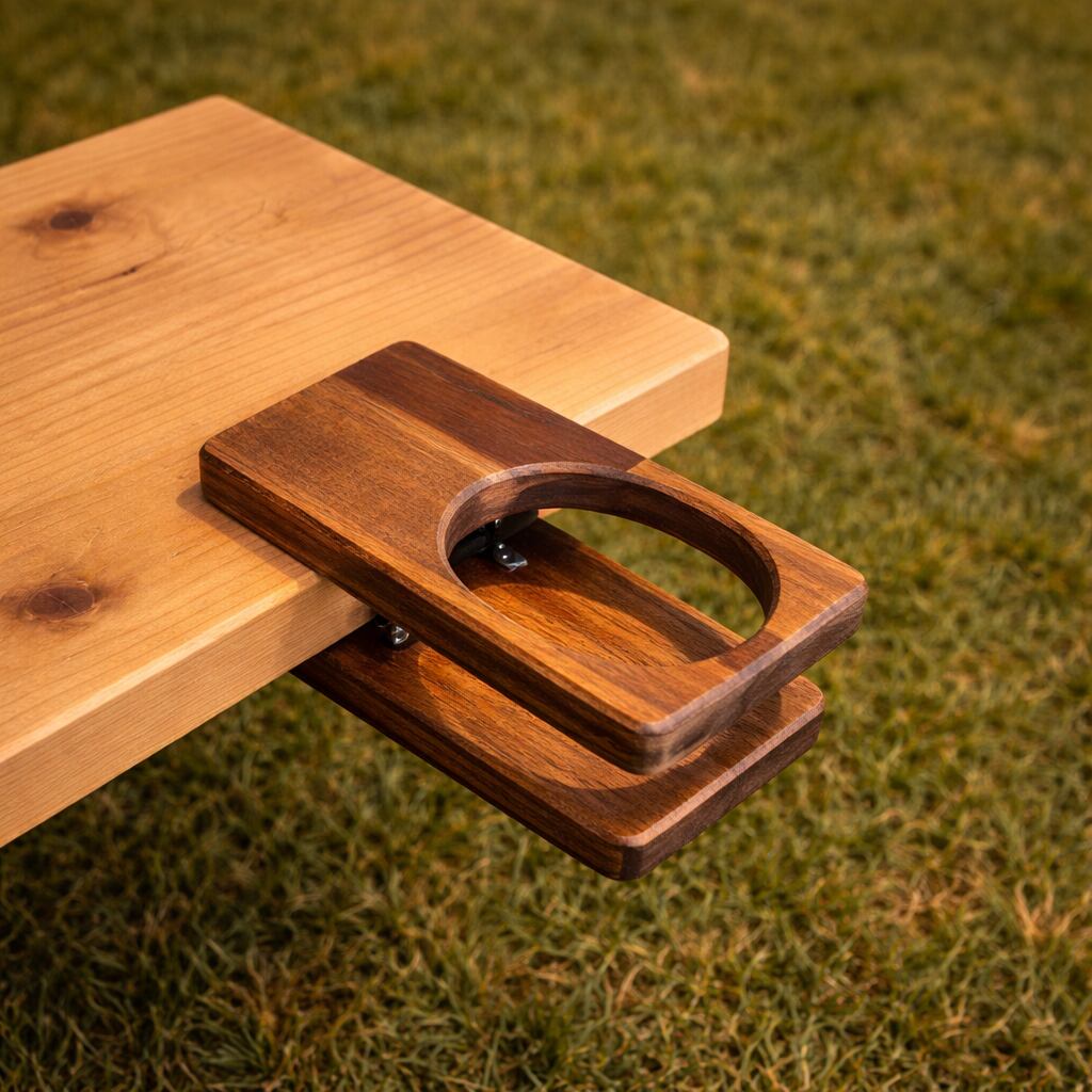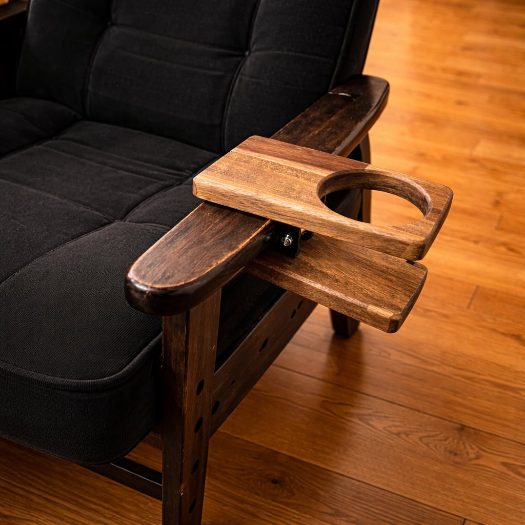 テーブルや肘掛けに“挟むだけ”で使える木製ドリンクホルダーです。